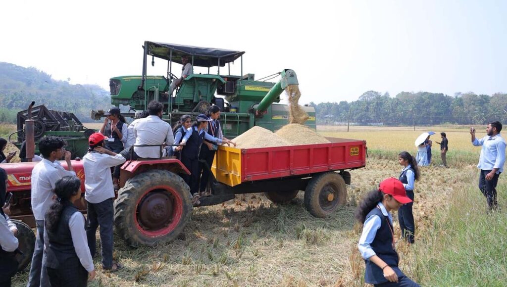 2025 സെപ്റ്റംബറിലാണ് ഉമ നെൽ വിത്തുകൾ പാടത്തിറക്കിയത്. ഞാറ്റടി ഒരുക്കലും ട്രാൻസ്പ്ലാന്റർ എന്ന നടീൽ യന്ത്രം ഉപയോഗിച്ചുള്ള ഞാർ നടീലും വളപ്രയോഗവും എല്ലാം കുട്ടികൾ തന്നെയാണ് ചെയ്തത്. തികച്ചും ജൈവ രീതികൾ മാത്രം ഉപയോഗിച്ചാണ് കൃഷി. കൊയ്ത്ത് തുടങ്ങിവെച്ചതും കുട്ടികൾ തന്നെ. പൂർത്തിയാക്കിയത് കൊയ്ത്ത് യന്ത്രവും. കോഴ്സിന്റെ ഭാഗമായാണ് കൃഷിയിടത്തേക്ക് ഇറങ്ങിയതെങ്കിലും കൃഷിയിൽ പൂർണമായും ആത്മസമർപ്പണം നടത്തിയാണ് ഈ വിദ്യാർത്ഥി സംഘം വിജയം കൊയ്തത്. 2000 കിലോ വിളവ് ലഭിച്ചതിൽ കുറച്ചു നെല്ല് പുഴുങ്ങുന്നതും കുത്തുന്നതും തവിട് കളയുന്നതും അവിലും മലരും ഉണ്ടാക്കുന്നതും അടക്കമുള്ള വിവിധ ഘട്ടങ്ങൾ പഠിക്കുന്നതിനായി മാറ്റിവെക്കും. കുറച്ചു ഭാഗം കുട്ടികൾക്ക് നൽകും.