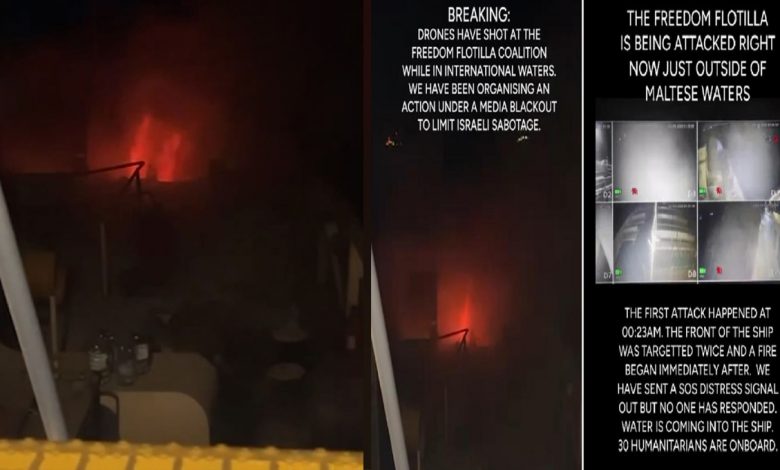 വെള്ളിയാഴ്ച പുലർച്ചെയാണ് ഫ്രീഡം ഫ്ലോട്ടില്ല സഹായ സന്ദേശം അയച്ചത്. ഡ്രോൺ ആക്രമണം മൂലമുണ്ടായ തീ അണയ്ക്കാൻ കപ്പലിനെ സഹായിക്കുന്നതിന് മാൾട്ടയിലെ സായുധ സേനയുടെ പട്രോളിംഗ് ബോട്ട് അയച്ചിട്ടുണ്ട്. കപ്പലിന്റെ മുൻഭാഗം രണ്ടുതവണ ലക്ഷ്യമിട്ടതായും അതിന്റെ ഫലമായി തീപിടുത്തവും ഹല്ലിൽ വിള്ളലും ഉണ്ടായതായും പറഞ്ഞു.”ഡ്രോൺ ആക്രമണം കപ്പലിന്റെ ജനറേറ്ററിനെ പ്രത്യേകമായി ലക്ഷ്യം വച്ചുള്ളതാണ് . അന്താരാഷ്ട്ര മനുഷ്യാവകാശ പ്രവർത്തകരുള്ള കപ്പൽ ഇപ്പോൾ മുങ്ങാനുള്ള സാധ്യതയിലാണെന്നും സൈപ്രസ് തങ്ങളുടെ SOS ദുരന്ത സിഗ്നലിന് മറുപടി നൽകിയതായും തീ അണയ്ക്കാൻ AFM ഒരു പട്രോളിംഗ് ബോട്ട് സ്ഥലത്തേക്ക് അയച്ചതായി മാൾട്ട സർക്കാർ വൃത്തം ടൈംസ് ഓഫ് മാൾട്ടയോട് സ്ഥിരീകരിച്ചു. ബോട്ട് മാൾട്ടയുടെ പ്രാദേശിക ജലാതിർത്തിക്ക് 14 നോട്ടിക്കൽ മൈൽ പുറത്താ ണെന്നും ആർക്കും പരിക്കേറ്റിട്ടില്ലെന്നും സ്രോതസ്സ് പറഞ്ഞു. തീപിടുത്തത്തിന്റെ കാരണം ഇതുവരെ സ്ഥിരീകരിച്ചിട്ടില്ല.
