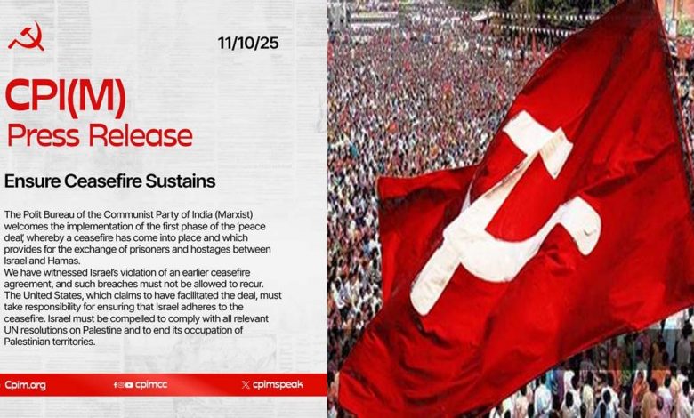 വെടിനിർത്തൽ കരാർ ഇസ്രയേൽ ലംഘിക്കില്ലെന്ന് ഉറപ്പുവരുത്തണം : സിപിഐഎം