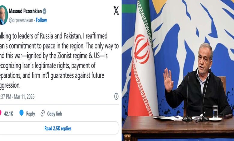 യുദ്ധം അവസാനിപ്പിക്കാന്‍ ഇറാന് മുന്നിലുള്ള വിഷയങ്ങള്‍ റഷ്യ, പാകിസ്ഥാന്‍ രാജ്യങ്ങള്‍ എന്നിവിടങ്ങളിലെ നേതാക്കളുമായി സംസാരിച്ചപ്പോള്‍ അറിയിച്ചിരുന്നു. സയണിസ്റ്റ് ഭരണകൂടവും യുഎസും ആരംഭിച്ച ഈ യുദ്ധം അവസാനിപ്പിക്കാനുള്ള ഏക മാര്‍ഗം ഇറാന്റെ നിയമാനുസൃത അവകാശങ്ങള്‍ അംഗീകരിക്കുക, നഷ്ടപരിഹാരം നല്‍കുക, ഭാവിയിലെ ആക്രമണങ്ങള്‍ക്കെതിരെ ഉറച്ച അന്താരാഷ്ട്ര ഗ്യാരണ്ടികള്‍ നല്‍കുക എന്നിവയാണ്. എന്ന് ഇറാന്‍ പ്രസിഡന്റ് ട്വിറ്ററില്‍ കുറിച്ചു.