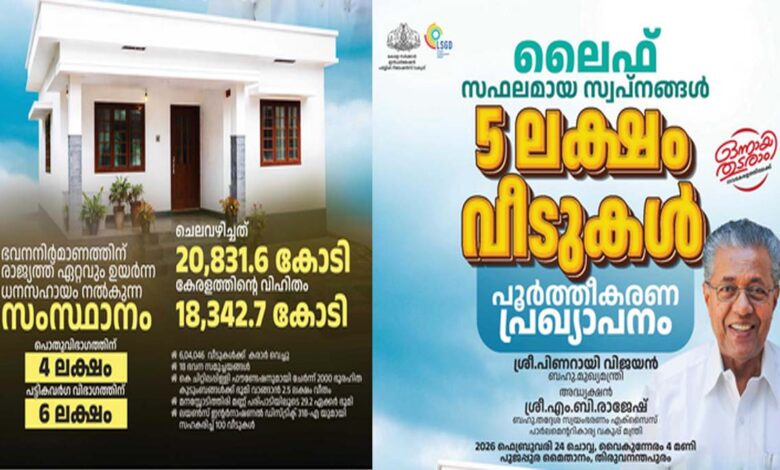 ലൈഫ് മിഷൻ പദ്ധതിയിലൂടെ പൂർത്തിയായത് അഞ്ച് ലക്ഷത്തിലേറെ വീടുകൾ; ഔദ്യോഗിക പ്രഖ്യാപനം ഇന്ന്