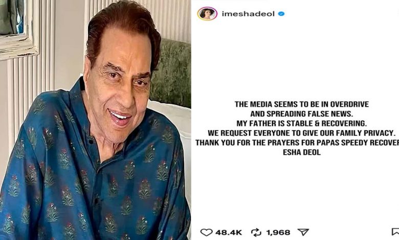 ഡോക്ടര്‍മാരുടെ മേല്‍നോട്ടത്തിലാണെന്നും ഉടന്‍ സുഖം പ്രാപിക്കുമെന്നും സണ്ണി ഡിയോൾ പറഞ്ഞു. ഇഷയുടെ പോസ്റ്റോടെ പ്രതിരോധ മന്ത്രി രാജ് നാഥ് സിംഗ് അനുശോചനം ട്വീറ്റ് പിന്‍വലിച്ചു. ധർമേന്ദ്ര മരിച്ചതായി ദേശീയ മാധ്യമങ്ങൾ റിപ്പോർട്ട് ചെയ്തിരുന്നു.