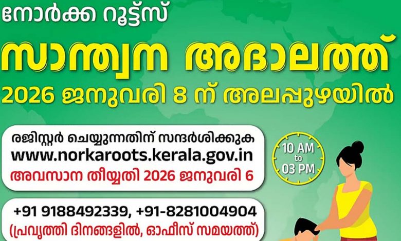 നോര്ക്ക റൂട്ട്സ് സാന്ത്വന അദാലത്ത് ഇന്ന് ആലപ്പുഴയില്