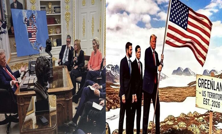 മറ്റൊരു പോസ്റ്റില് ഗ്രീന്ലാന്ഡില് യുഎസ് പതാകയുമേന്തി നില്ക്കുന്ന ചിത്രവും ട്രംപ് പങ്കുവെച്ചിട്ടുണ്ട്. വൈസ് പ്രസിഡന്റ് ജെഡി വാന്സ്, യുഎസ് സ്റ്റേറ്റ് സെക്രട്ടറി മാര്ക്കോ റൂബിയോ എന്നിവരോടൊപ്പമാണ് ട്രംപ് നില്ക്കുന്നത്. ഗ്രീന്ലാന്ഡ് യുഎസ് പ്രദേശമാണെന്നും, സ്ഥാപിക്കപ്പെട്ടത് 2026ല് ആണെന്നും സൂചിപ്പിക്കുന്ന ഒരു ബോര്ഡും അരികിലായി ചിത്രീകരിച്ചിരിക്കുന്നു. ചിത്രത്തില് ട്രംപിനൊപ്പം ജെഡി വാന്സും മാര്ക്കോ റൂബിയോയും ഗ്രീന്ലാന്ഡില് അമേരിക്കന് പതാക നാട്ടുന്നതായി കാണാം.