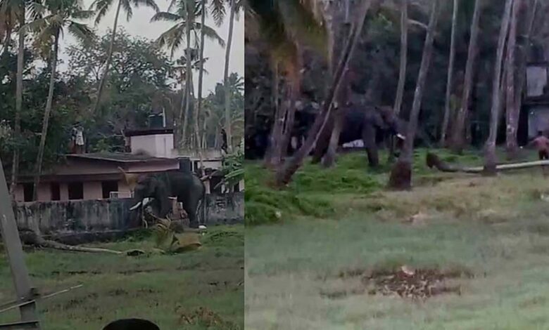 തൃപ്രയാറിൽ ലോറിയില്‍ നിന്ന് ഇറക്കുന്നതിനിടെ ആന ഇടഞ്ഞു; വീടുകളുടെ ഗേറ്റ് തകര്‍ത്തു, തെങ്ങുകള്‍ കുത്തിമറിച്ചു